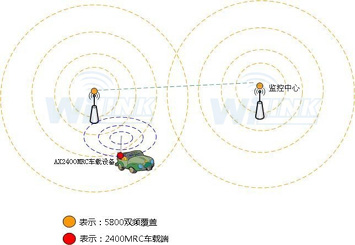 基站及节点设备采用双频无线网络设备。该设备分别有一个2.4GHz射频端口,一个5.8GHz射频端口。5.8GHz端口用于组建主干链路,2.4GHz端口用于无线覆盖,使在该无线网络范围内移动的车载监控图像实时传回监控中心。